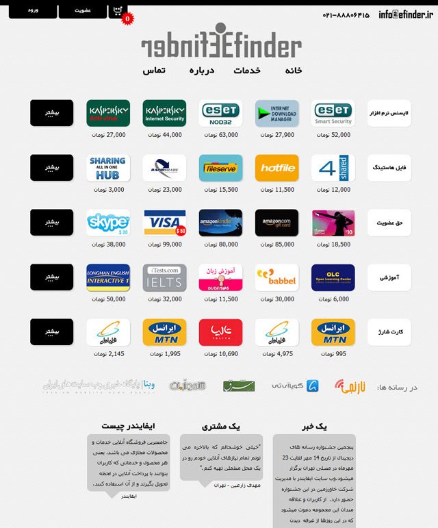 ایفایندر؛ جامعترین فروشگاه آنلاین خدمات و محصولات مجازی می باشد، یعنی هر محصول و خدماتی که کاربران بتوانند با پرداخت آنلاین در لحظه تحویل بگیرند و از آن استفاده کنند.