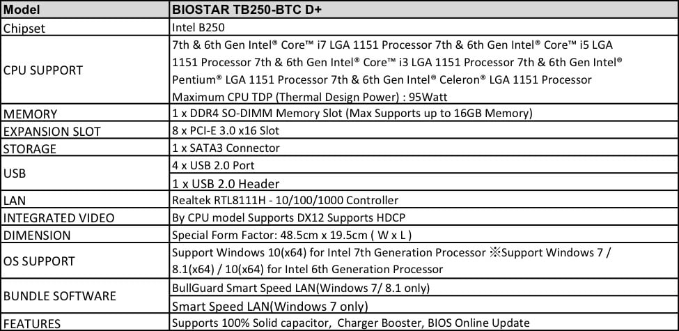 هشت اسلات PCI-X16 که با کارت گرافیک های AMD و NVIDIA سازگار هستند، و درگاه های USB 2.0، رابط HDMI و LAN تنها مواردی هستند که در پشت مادربرد به چشم می خورند. یک اسلات حافظه رم SO-DIMM بر روی آن قرار دارد که می تواند میزبان حداکثر 16 گیگابایت حافظه DDR4 باشد. یک رابط نسل سوم ساتا نیز برای اتصال یک ذخیره ساز به آن، در نظر گرفته شده است. مادربرد BIOSTAR TB250-BTC D+ با قیمت 149 دلار عرضه می گردد و باقی اطلاعات را می توانید در اسلاید مشخصات مطالعه نمائید.
