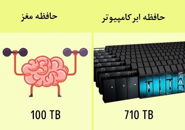 مغز در حدود 100 میلیارد نورون دارد که هرکدام از آنها در حدود 1000 سیناپس بالقوه برای ذخیره داده ها، ایجاد میکنند. به طور نظری مغز در حدود 100 ترابایت اطلاعات دارد. برای مقایسه کافیست بدانید که سیستم تیتان، یکی از ابر کامپیوترهای قدرتمند جهان، 710 ترابایت حافظه دارد.