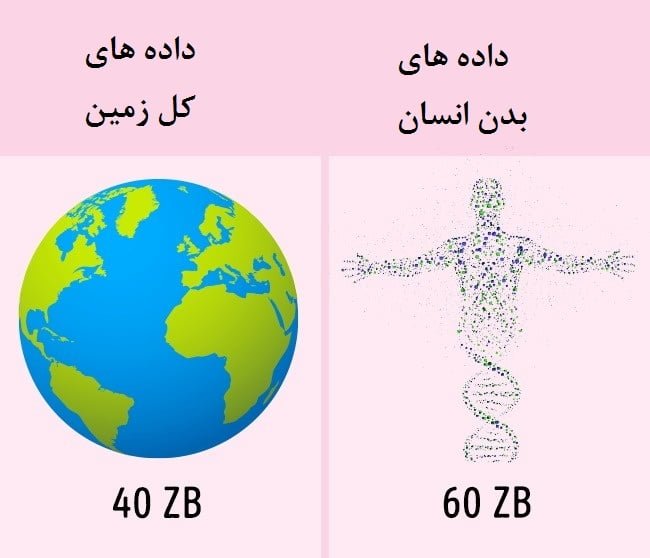 باتوجه به اطلاعات کانال علمی Veritasium در یوتیوب، تا سال 2020 حجم کل اطلاعات ذخیره شده توسط بشریت به 40 زتابایت (10 به توان 21 بایت) خواهد رسید. حال این میزان را با بدن انسان مقایسه کنید که 60 زتابایت داده در خود ذخیره کرده است.