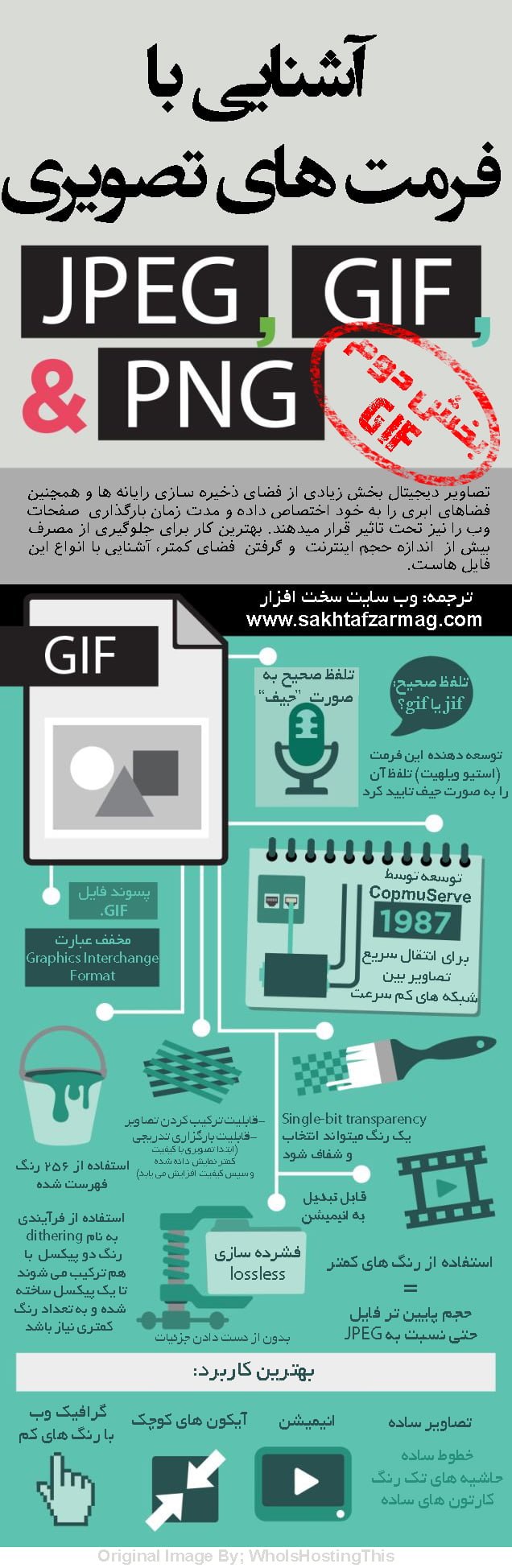 طبق توضیحاتی که قبلا داده شده بود، فرمت های JPEG، PNG و GIF را انتخاب کرده ایم که در سه بخش جداگانه در اختیار شما قرار خواهند گرفت. قسمت اول از اینفوگرافی های آشنایی با فرمت های تصویری سخت افزار به JPEG اختصاص داشت و قسمت دوم نیز به GIF می پردازد. برای مشاهده تصویر با کیفیت بیشتر می توانید آن را در یک پنجره جداگانه باز کنید و یا فایل اینفوگرافی شماره 2 را از لینک انتهای مطلب دانلود کنید.
