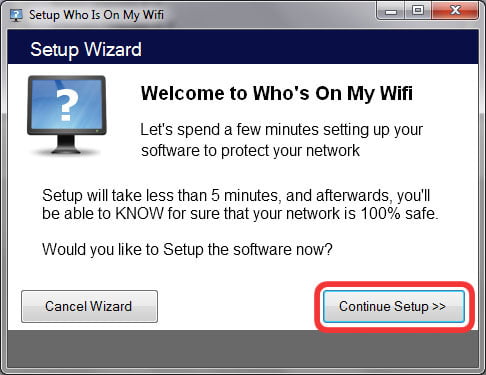 در اولین ورود به برنامه، راهنما یا ویزاردی (Wizard) ظاهر می شود که با راهنمایی کاربر قصد دارد اسکن اولیه شبکه را آسان تر سازد. بر روی “Continue setup” کلیک کنید.