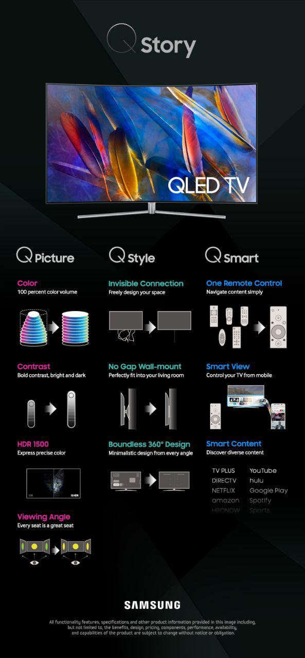 سری QLED سامسونگ از همان ابتدا با اتکا بر سه مزیت رقابتی توانست پیشتاز بازار تلویزیونهای بالا رده شود. این سه اصل که به طراحی Q، تصویر Q و هوشمندی Q شناخته میشوند در واقع نشان دهنده سه قدم بزرگ سامسونگ برای تغییر دنیای تلویزیونهای برتر و عرضه محصولی برتر است. هدف از این نوآوریها آن است که تلویزیون شما با هر دکوراسیونی در اتاق سازگار باشد و نکته جالب آنکه میتواند تصویر دیوار پشت تلویزیون را هم روی صفحه خود نشان دهد.