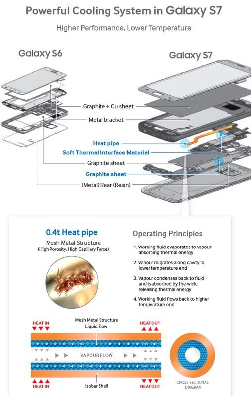 طبق این مصاحبه که با مهندسین سامسونگ انجام گرفته است، نشان میدهد مهندسین نمیتوانستند راه حلی را پیدا کنند که کار سیستم مشابه را انجام دهد، بنابراین سیستم جدیدی را از ابتدا طراحی کردند و آلیاژ ها و شبکه های فلزی را داخل لوله های حرارتی قرار دادند و سپس آزمایش کردند و جایگذاری دقیقی را انجام دادند تا استحکام ساختاری این سیستم نیز حفظ شود. نتیجه ی این کار این شد که رسانایی گرما در انتقال دهنده ی ی گرما موجود در گلکسی اس 7، پنجاه برابر بیشتر از لوله های مسی خالص است. در لوله های حرارتی مسطح مقدار بسیار کمی آب وجود دارد که به طور دائم در حال تبخیر شدن هستند و با همان حالت بخار به سمت پردازنده روانه میشوند و چیپست را خنک میکنند و پس از متراکم شدن ، گرما را به طور مساوی دفع میکنند. بدین ترتیب، گیمر هایی که همیشه با مشکل گلوگاه شدن CPU و GPU در گوشی هوشمند خود مواجه بودند دیگر چنین مشکلی نخواهند داشت. اما به واقع چرا سامسونگ این همه دردسر را به جان خود خریده است؟ پاسخ این سوال را دو تن از مهندسین سامسونگ این گونه پاسخ داده اند: