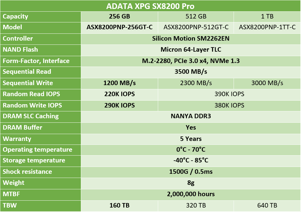 مطابق مشخصات اس اس دی XPG SX8200 Pro  مجهز به کنترلر SM2262EN ساخت Silicon Motion می باشد. مدل مورد بررسی ما 256 گیگابایتی است که سرعت خواندن و نوشتن متوالی آن به ترتیب 3500MB و 1200MB است. سرعت خواندن و نوشتن اتفاقی آن برابر 220K IOPS و 290K IOPS است.