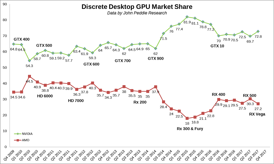 در همین حال گزارش های جدید حاکی از آن است که AMD در حال از دست دادن سهم خود از بازار کارت گرافیک های گیمینگ است. از سوی دیگر فروش جهانی این محصولات در فصل پایانی سال 2017، افزایش یافته است. سهم بازار در اختیار AMD از 30% به 27% سقوط کرده و این مسئله همچنان ادامه دارد. سهم کمپانی NVIDIA نیز نزدیک به 73% شده است.