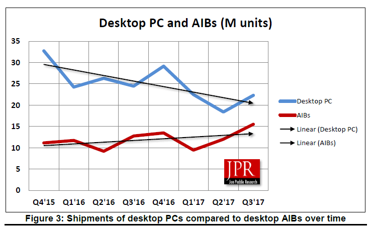 چندی پیش مطالبی را در زمینه آمار فروش برندهای تولید کننده تراشه های گرافیکی منتشر کردیم که همچنان به یکه تازی NVIDIA اذعان داشته و موسسه JPR 3 ماهه سوم و ماه های پایانی سال 2017 را به عنوان بازه زمانی خود در این بررسی در نظر گرفته بود. به طور سنتی، AMD عموما 30% الی 32% از سهم بازار کارت گرافیک ها را در اختیار دارد و مقداری باقی مانده به طور کلی برای NVIDIA است. هر چند که این سهم بندی بیشتر بر اساس کارت گرافیک های دسکتاپ و نه مجتمع مقیاس بندی شده است، اما سهم Intel نیز در بخش تراشه های مجتمع در حال رشد نسبی است.
