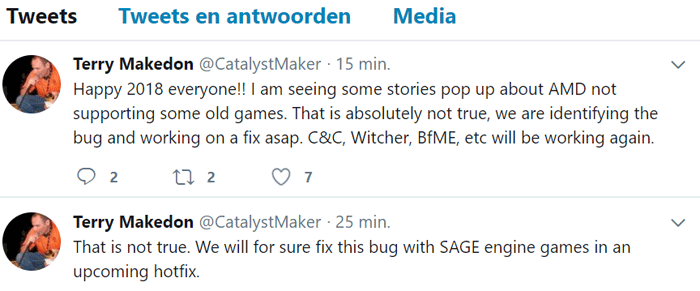Terry Makedon یکی از مهندسان AMD در واکنش به این مسئله پیامی را در توئیتر خود منتشر کرد که مضمون نهایی آن شامل عدم پشتیبانی AMD آدرنالین از بازی های قدیمی بوده و ایشان اشاره کرده اند که این شرکت برای رفع ایرادات بازی های قدیمی اقدامی نخواهد کرد. درست پس از آن بود که فشار بر AMD توسط کاربران افزایش یافته و آقای Terry Makedon مجددا مجبور ارائه یک توئیت جدید شده است که در آن قول رفع ایراد مورد بحث را داده است. بخشی از این مشکل به ناسازگاری موتور SAGE با درایور آدرنالین مرتبط است. این هات فیکس به زودی منتشر خواهد شد.