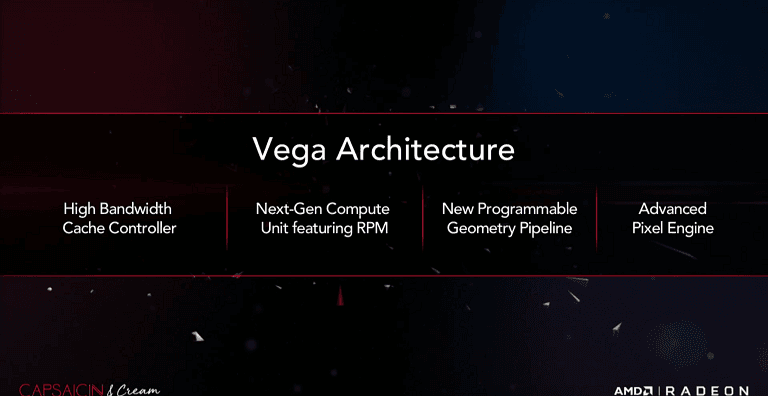 ((این شرکت به دو فناوری (HBC (High-Bandwidth Cache و (HBCC (High-Bandwidth Cache Controller اشاره کرده است؛ AMD امیدوار است با رساندن پهنای باند به 512 گیگابایت در ثانیه، سربار پردازشی GPU را کاهش داده و با استفاده از کش های آدرس مجازی، نیاز به پشته های بیشتر حافظه را از بین ببرد. فناوری HBCC دقیقا همان چیزی است که AMD برای رفع مشکلات کارت گرافیک Fury X در Vega استفاده خواهد کرد؛ کارت گرافیک Fury X نخستین محصولی است که از حافظه های پر سرعت HBM1 استفاده کرد اما در حجم های سنگین حافظه با مشکلاتی مواجه می شد. سیستم کش مجازی که در گذشته نیز اشاراتی بدان شده بود، می تواند حافظه گرافیکی را به دو برابر (به ادعای AMD) افزایش داده و هسته را تامین نماید.))