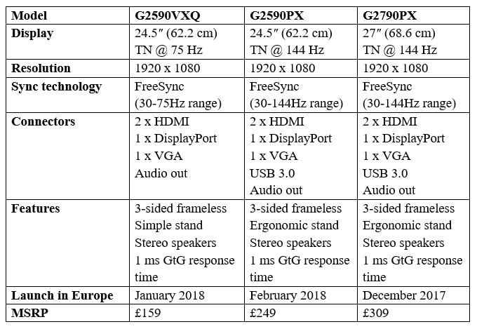 مدل های PX دارای فرکانس 144 هرتز هستند و هر 3 مدل از فناوری AMD FreeSync پشتیبانی می کنند. همچنین زمان پاسخ به فرکانس در هر 3 مانیتور برابر با 1 میلی ثانیه است. مانیتورهای G2590PX و G2790PX دارای رابط های DisplayPort, HDMI, VGA و USB 3.0 هستند؛ همچنین در بخش فناوری های اختصاصی نیز می توان به AOC Low Input Lag Mode و AOC Shadow Control به منظور کاهش سایه اندازی و کاهش زمان تاخیر اشاره کرد. مانیتورهای جدید AOC با نمایش دقت FHD، دارای فناوری کنترل محیط های تاریک هستند تا در این بخش از بازی ها، تصاویر مفهوم تری را ارئه نمایند. با وجود آنکه دو نمونه از مانیتورهای فوق کمی زود تر در بازار اروپا لانچ شده اند، اما در اوایل سال 2018 شاهد عرضه هر 3 مانیتور در بازار های جهانی خواهیم بود. دیگر مشخصات فنی و قیمت گذاری را می توانید در جدول زیر مطالعه نمائید.