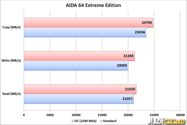زماني که براي اولين بار حافظه Armor را روي سيستم نصب کرديم، بدون آنکه نيازي به ورود به بايوس باشد، سيستم با فرکانس حافظه 2133 مگاهرتز بوت شد. در اين حالت همانطور که قبلاً گفتيم، زمان تأخير حافظه به ترتيب 30-11-12-11 بود. براي اينکه تست، استاندارد لازم را براي مبنا قرار گرفتن داشتهباشد، از نرمافزارهاي شناختهشدهاي استفاده کرديم که توسط سايتها و مجلات معروف جهاني ديگر هم استفاده ميشوند. بهطور کلي، براي تست به سراغ نرمافزارهاي AIDA 64، Custom PC، PC Mark7، Super pi، Cinebench و Metro 2033 رفتيم که هرکدام ميتواند به گونهاي تأثير تغيير فرکانس حافظه را در کارايي مشخص کند. ابتدا تستها را به صورت دقيق در حالت استاندارد ثبت کرديم و در مرحله بعد به سراغ تغيير فرکانس رفتيم. در اين بخش سعي کرديم تا جايي که سيستم بتواند بدون مشکلي تستها را انجام دهد، حافظه سيستم را اورکلاک کنيم. در اين حالت، پروفايل XMP را در بايوس غيرفعال کرديم و ابتدا ضريب فرکانس حافظه را افزايش داديم اما حافظه در فرکانس 2200 مگاهرتز بوت شد و زماني که ضريب را به 24 افزايش داديم (2400 مگاهرتز) حتي با تغيير ولتاژ و ديگر موارد هم سيستم بوت نشد (البته همانطور که گفتيم، اين موضوع به مادربورد و پردازنده سيستم هم بستگي دارد).