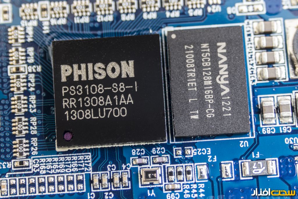 Apacer در این درایو از کنترلر Phison استفاده کرده که در مقایسه با کنترلرهای Sandforce یا Marvell از عمومیت کمتری برخوردار و کمتر شناخته شده است (تصویر 2). کنترلر به کار رفته در این درایو مدل PS3108-S8-1 است توانایی پشتیبانی از انواع حافظههای NAND از نوع MLC و SLC را دارد. همچنین این مدل امکان پشتیبانی از حافظههای DDR III به عنوان Cache را دارد. Apacer در این درایو نیز این عمل را انجام داده و یک چیپست حافظه NANYA NT5CB128M16BP-CG را در کنار کنترلر درایو قرار داده است. این چیپست حافظه RAM، دارای ظرفیت 128 مگابایت بوده و از نوع DDR3 است. این حافظه تاثیر بالایی در افزایش سرعت نوشتن اطلاعات خواهد داشت. البته با توجه به مشخصات اعلام شده از سوی Apacer و سرعت نوشتن اطلاعات صد مگابایت در ثانیه در نسخه 64 گیگابایتی، به نظر میرسد درایو 64 گیگابایتی فاقد این حافظه RAM باشد.