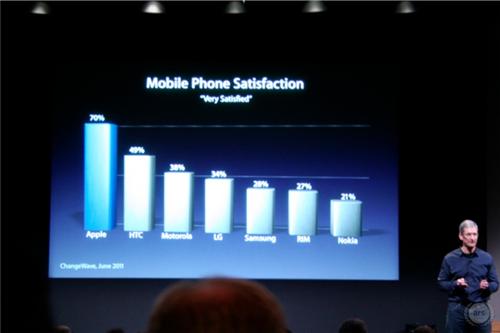 پس از اشاره به موفقیت های کسب شده در سیستم های Mac و پخش کننده های iPod، او به حضار می گوید که امروز شما به خاطر iPhone اینجا جمع شده اید. iPhone 4 در مدت زمانی کوتاه به اندازه نیمی از مجموع تمامی iPhone های فروخته شده از نسل های قبل به فروش رسیده است و از همین بابت، iPhone تلفن هوشمند شماره یک جهان به شمار می آید. سپس او در تصویری که طبق آمار های JD Powers تهیه شده، نشان می دهد که iPhone در صدر رضایت مشتریان قرار دارد.