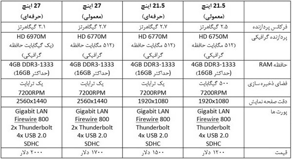 مدتی پس از معرفی مک بوک های جدید اپل، این شرکت چند روز قبل iMac جدید این شرکت را نیز معرفی کرد و همانطور که همگان انتظار داشتند، در این سری نیز از پردازنده های چهارهسته ای Sandy Bridge استفاده شده است (البته مدل دقیق آنها مشخص نیست). سری 2011 در دو مدل 21/5 اینچ و 27 تولید شده که براساس رده و سایز صفحه نمایش از یکی از مدل های پردازنده گرافیکی سری HD 6700M بهره می برد. مانند Macbook سری 2011 این شرکت، در این سیستم ها نیز از پورت Thunderbolt استفاده شده است، اما اثری از درایونوری Blu-Ray و پورت USB 3.0 که در حال حاضر بسیار پرکاربردتر از پورت جدید Thunderbolt هستند دیده نمی شود. سیستم های جدید 1200 تا 2000 دلار قیمت گذاری شده است. در جدول زیر مشخصات فنی مدل های معرفی شده آمده است.