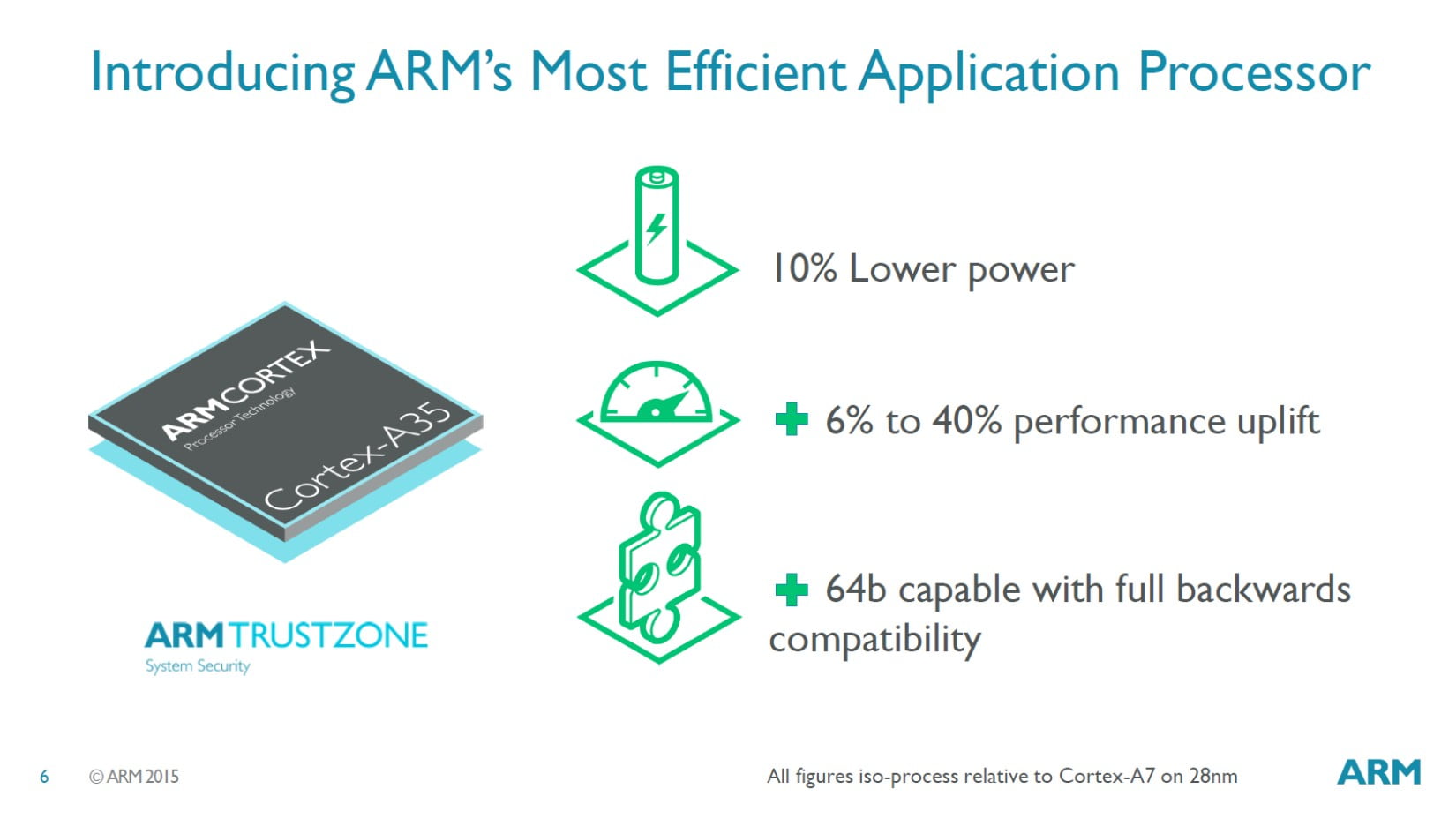 به لحاظ ابعاد فیزیکی، A35 حدود 25 درصد کوچکتر از A53 بوده و 35 درصد انرژی کمتری می سوزاند، در حالی که راندمان آن (یا نسبت قدرت پردازشی به انرژی مصرفی) 25 درصد بیشتر است. به این ترتیب Cortex-A35 می تواند در بسیاری موارد جایگزین Cortex-A53 و Cortex-A7 شده و یا در پیکربندی big.LITTLE با هسته های پردازشی قدرتمندی چون Cortex-A72 یا Cortex-A57 ترکیب گردد. جالب اینکه حتی برخی از اجزای A35 جدیدتر از A72 بوده و برای همین تا این اندازه در زمینه مصرف انرژی بهینه عمل می کند. پایان 2016 زمانی خواهد بود که نخستین ساعت های هوشمند یا دیگر محصولات مبتنی بر Cortex-A35 را در بازار خواهیم دید.