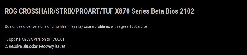 ایسوس سرانجام بایوس جدیدی برای رفع این مشکل منتشر کرد. نسخه 2102 اکنون برای مادربردهای AM5 سری 600 و 800 در دسترس قرار دارد. در یادداشت انتشار این نسخه، بهروزرسانی میکروکد AGESA به 1.3.0.0a ذکر شده که پیشتر در بایوس بتای 2101 نیز ارائه شده بود. با این حال، اصلاح مشکل بازیابی BitLocker اهمیت بالایی دارد؛ زیرا این اختلال نارضایتی گستردهای ایجاد کرده بود و ایسوس نیز آن را تایید کرده بود.