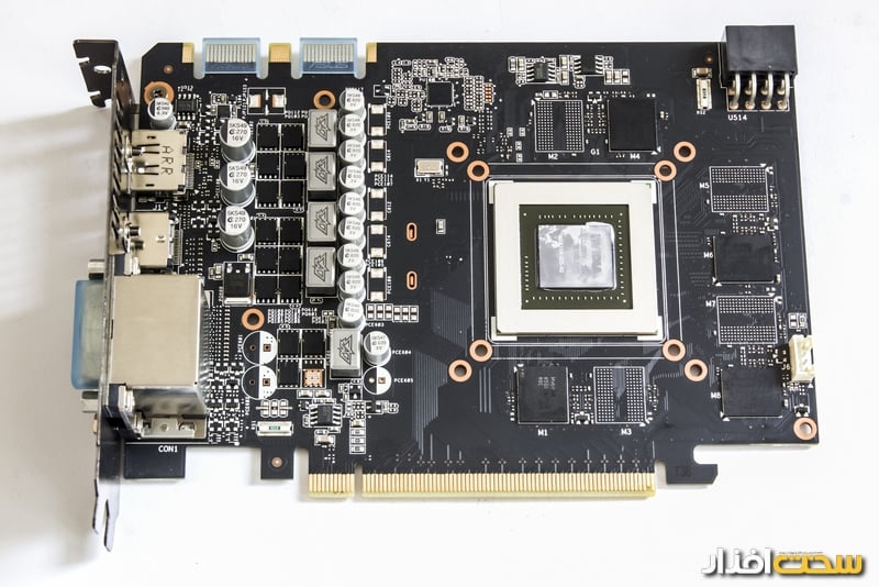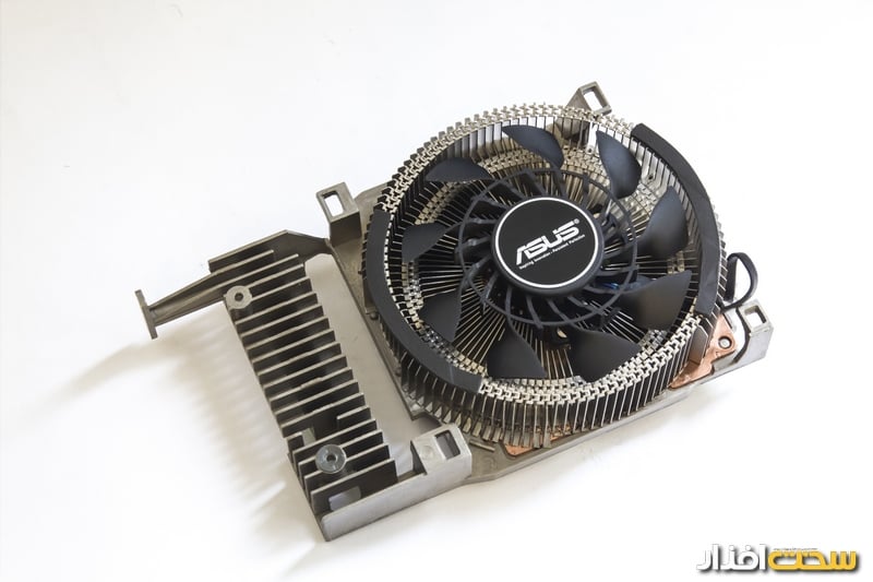 فن جدید دارای دو سری پره است و به طراحی خص خود میتوانند به خوبی گرما را از داخل کارتگرافیک خارج کنید. دور تا دور فن صفحات فلزی قرار گرفته است و در زیر فن نیز، یک Vapor Chamber کوچک (مشابه آنچه در کارتهای گرافیک GTX 580 یا کارتهای گرافیک سری HD 6900 کمپانی AMD دیده بودیم) قرار دارد تا بتواند به سرعت گرما را از پردازنده گرافیکی با سطح بالا منتقل نماید. در سمت چپ خنک کننده، هیت سینک دیگری متصل به کل سیستم خنک کننده قرار گرفته تا بتواند بخشی از گرمای مربوط به اجزای مدار رگولاتور را دور کنید. با بازکردن کارت گرافیک مشاهده میکنیم که یک مدار رگولاتور پنج فاز برای تامین برق پردازنده گرافیکی و ماژولهای حافظه در نظر گرفته شده است.