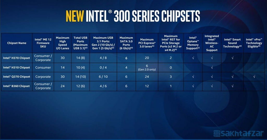 چیپ های جدید معرفی شده از طرف شرکت اینتل در حال حاضر صرفا سازگار با پردازنده های نسل هشتم یا خانواده Coffee Lake می باشند. در این میان چیپ H370 قوی ترین چیپ بعد از Z370 است. اینتل برای کاهش قیمت چیپ سری 300 خود، امکانات اورکلاک را برای H370 حذف کرده است، حداکثر فرکانس رم را به 2666 مگاهرتز محدود، و تعداد خطوط PCIe را کاهش داده است تا امکان SLI میسر نباشد. حذف این امکانات لزوما به معنای ضعف H370 نیست و این چیپ می تواند برای انواع عملیات های محاسباتی و گیمینگ مورد استفاده قرارگیرد. اینتل همچنین یکسری پردازنده جدید به خانواده Coffee Lake اضافه کرده است، که شاید مهمترین آنها i5 8600 و i5 8500 هستند که جای خالی فاصله ما بین پردازنده های فعلی i5 8400 و i5 8600K را پر می کنند و در رده ی پایین هم پردازنده جدید الورود i3 8300 بالاتر از i3 8100 خواهد ایستاد. پردازنده های ضریب بسته کافی لیک بهترین انتخاب برای چیپ های H370، B360 هستند.