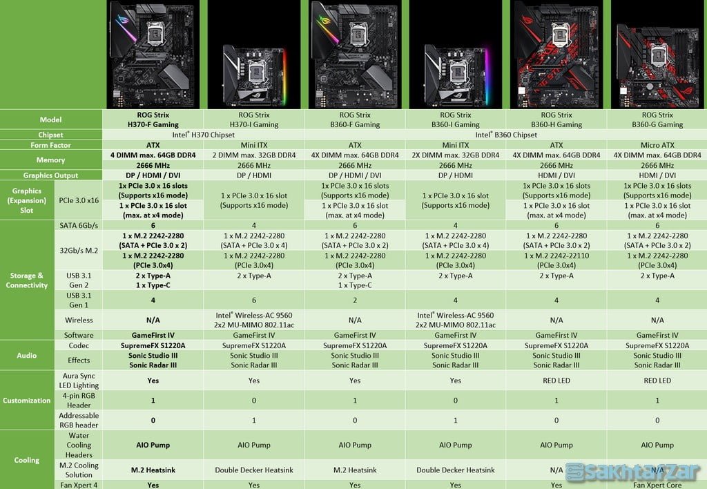 شرکت ایسوس تا کنون تعداد 8 عدد مادربرد H370 را معرفی کرده است که البته در جدول فوق که برگرفته از وبسایت ایسوس است، فقط دو مدل H370-i و H370-F قابل مشاهده است. از این 8 مدل H370، یکی مخصوص ماینینگ است به نام ASUS H370 Mining Master که به آن در اینجا نمی پردازیم. مادربرد H370-i هم مخصوص سیستم های کوچک است که بررسی آن مجال دیگری می طلبد.