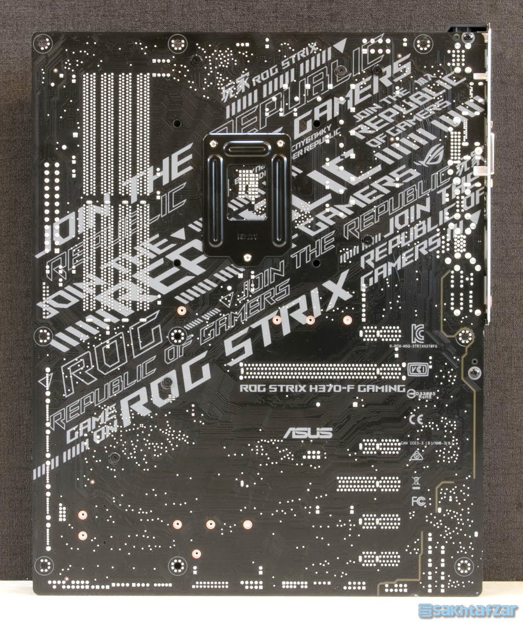 پشت مادربرد نیز از زیبا سازی بی نصیب نمانده، هرچند لزومی نداشت اما در پشت مادربرد هم خطوط و نقش و نگار STRIX، ROG، و GAMING به چشم می خورد. دقت به همین مسایل ریز که شاید بی اهمیت جلوه کند، نشان از توجه سازنده به کلیه ابعاد محصول نهایی خود دارد.