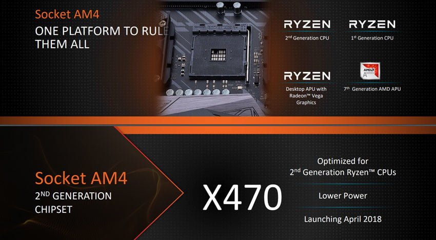 چیپ ست X470 نیز همچنان از سوکت AM4 بهره می برد بنابراین با پردازنده های هر دو نسل رایزن سازگار است. از مهمترین ویژگی های این چیپست بهینه شدن عملکرد آن و سازگاری کامل با پردازشگرهای رایزن 2 است.