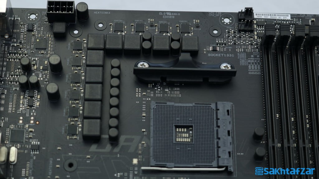 در بخش میانی مادربرد، چیزی که بیش از همه به چشم می آید سینک بزرگ روی چیپ ست است که تا اواسط مادربرد امتداد پیدا کرده است. با بازکردن سه چهار پیچ این سینک می تواند جدا شود و در زیر آن یک درگاه M.2 دیگر پنهان است. در حقیقت این مادربرد مجهز به دو درگاه M.2 است که به Lane های PCI-e متصل است. بدین ترتیب آرزوی RAID 0 کردن دو اس اس دی M.2 روی مادربرد های AMD رده Mainstream نیز براورده شد.