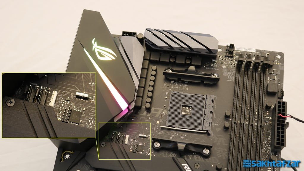 در زیر سینک خنک کننده پد چسب قراردارد که می تواند SSD M.2 در زیر خود را به لطف سینک خنک کند. شایان ذکر است اس اس دی نصب شده در این بخش می تواند تا 20 درجه خنک تر کار کند. ناگفته نماند جنس و کیفیت سینک های خنک کننده مادربرد های ایسوس مثال زدنی است.