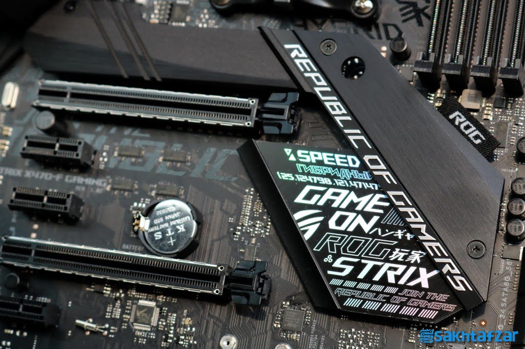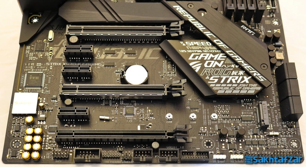 در زیر سینک چیپ ست یک درگاه M.2 دیگر قرار دارد. در بخش ارتباطات Storage همچنین شاهد حضور شش پورت SATA هستیم. سه شکاف PCIe X16 گرافیک و سه شکاف PCIe X1 روی مادربرد قرار دارند. در صورت استفاده از پردازنده های Ryzen دو شکاف اصلی می توانند از 2Way SLI به صورت X8-X8 و از 3Way Crossfire به صورت X8-X8-X4 مورد استفاده قرارگیرند. البته شکاف سوم دارای پهنای باند PCIe 2.0 می باشد.برای مدیریت کابل کشی راحت تر، ایسوس تلاش کرده است تمامی اتصالات و هدر های ثانویه را در لبه ی جنوبی مادربرد گرد هم آورد. از مهمترین درگاه ها خروجی پنل جلویی USB 3.1، دو خروجی USB 2.0، یک پورت COM، خروجی های RGB، و اتصالات فن می باشد.
