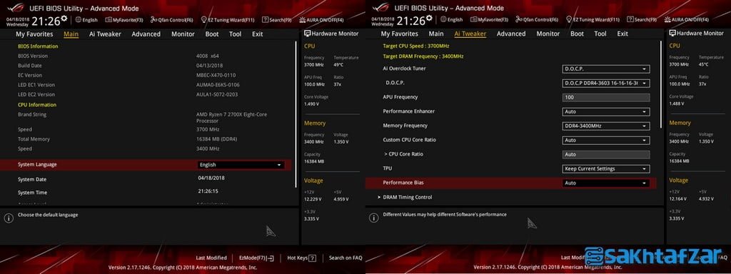 بایوس مادربرد و امکانات آن برای تنظیم و اورکلاک کاملا به روز شده و دقیق است. بایوس ایسوس پر از امکانات طبقه بندی و کلاس بنده شده و کار با آن راحت است. امکاناتی نظیر ذخیره کردن پروفایل های مختلف اورکلاک، دسترسی راحت به تنظیمات ریز بخش های مختلف برق رسانی به رم و پردازنده، در کنار سر فصل های مانیتورینگ و پایش ولتاژ های ورودی، بایوس بی نقصی را برای این مادربرد به ارمغان آورده است.