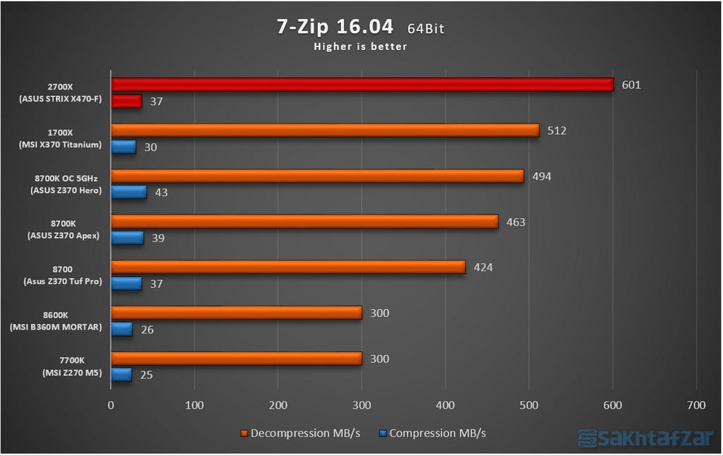 در تست 7Zip که قدرت پردازنده را در فشرده سازی و استخراج فایل ها می سنجد، در مقام قیاس سیستم های Mainstream، این پردازنده و مادربرد، صدر چارت را از آن خود کردند.