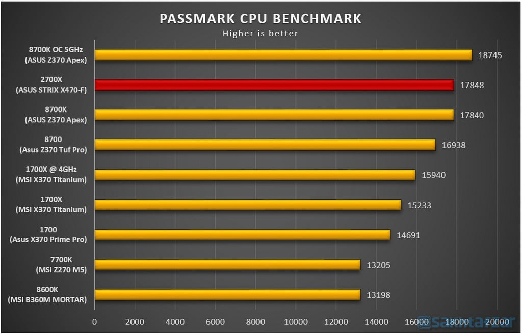 نتیجه ی تست پردازنده 2700X در بنچمارک Passmark تنه به تنه ی 8700K می زند. اگرچه 2700X دارای 4 رشته پردازشی بیشتر است اما شاید به دلیل آن که نتیجه این بنچمارک کمی وابسته به سرعت و فرکانس رم می باشد و از این نظر 8700K قوی تر است، 2700X در برابر 8700K کم می آورد.