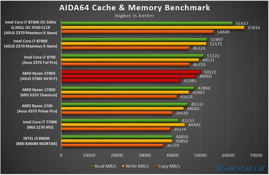 تست کش و حافظه رم AIDA64 به خوبی میزان پهنای باند در اختیار پردازنده را نشان می دهد. همانطور که در تصویر مشاهده می کنید 2700X بالاتر و بهتر از 1700X عمل می کند که این موضوع نشان دهنده بهبود عملکرد پردازنده جدید AMD است. اما علیرغم این برتری نسبت به 1700X، هنوز 2700X فاصله زیادی با 8700K دارد.