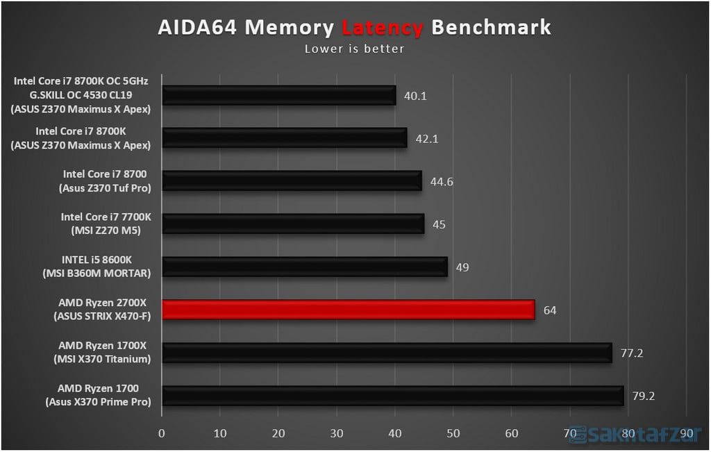 در تست سرعت تاخیر رم، می توان پیشرفت AMD را در ارتقای 2700X نظاره کرد. درحالیکه 1700X در وادی تاخیر بالای 75 نانوثانیه سیر می کرد، 2700X می تواند تاخیری در حوالی 64 نانو ثانیه داشته باشد. که البته هنوز فاصله زیادی با رقبای اینتلی دارد. اهمیت این بنچمارک در بازی های کامپیوتری است، که پیشتر خواهید دید این تاخیر بالا، همچنان 2700X را پشت سر پردازنده های اینتل نگه می دارد، اما همین حد از پیشرفت – اگرچه ناکافی – اما قابل تحسین است.
