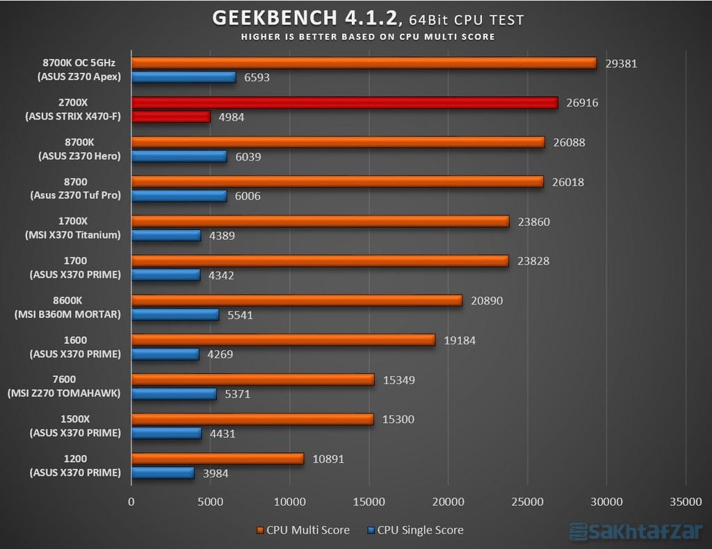 در تست Geekbench، در عملکرد چند رشته پردازشی، کمی 2700X بهتر از 8700K در حالت پیشفرض عمل می کند، اما نه به اندازه ای که با 16 رشته پردازشی از آن انتظار داریم. 8700K همچنان می تواند با اورکلاک تا 5 گیگاهرتز 2700X را پشت سر بگذارد. در زمینه قدرت تک هسته پردازشی، عملکرد 2700X نسبت به 1700X کاملا ارتقا یافته و تقریبا سنجش قدرت آن به امتیاز رنج 5000 تک هسته پردازشی Core i5 کابی لیک اینتل می رسد.