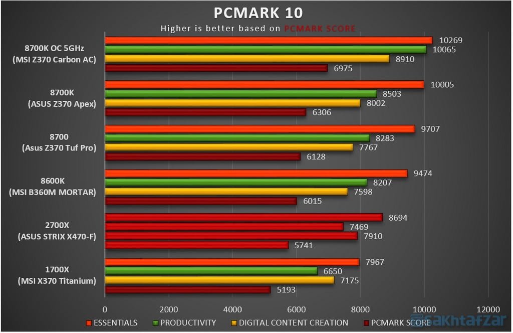 تست PCMARK 10 که یکی از جامع ترین و جدید ترین تست های شرکت فنلاندی Future Mark است، شامل بررسی و سنجش چهار بخش، عملکرد پردازشی پایه ای، اداری، رندرینگ و تبدیل های ویدیویی می شود. به نوعی تست ترکیبی از عملکرد کلی سیستم را مقایسه می کند که همانطور که در جدول مشاهده می کنید، 2700X موفق می شود بالاتر از 1700X قرارگیرد.