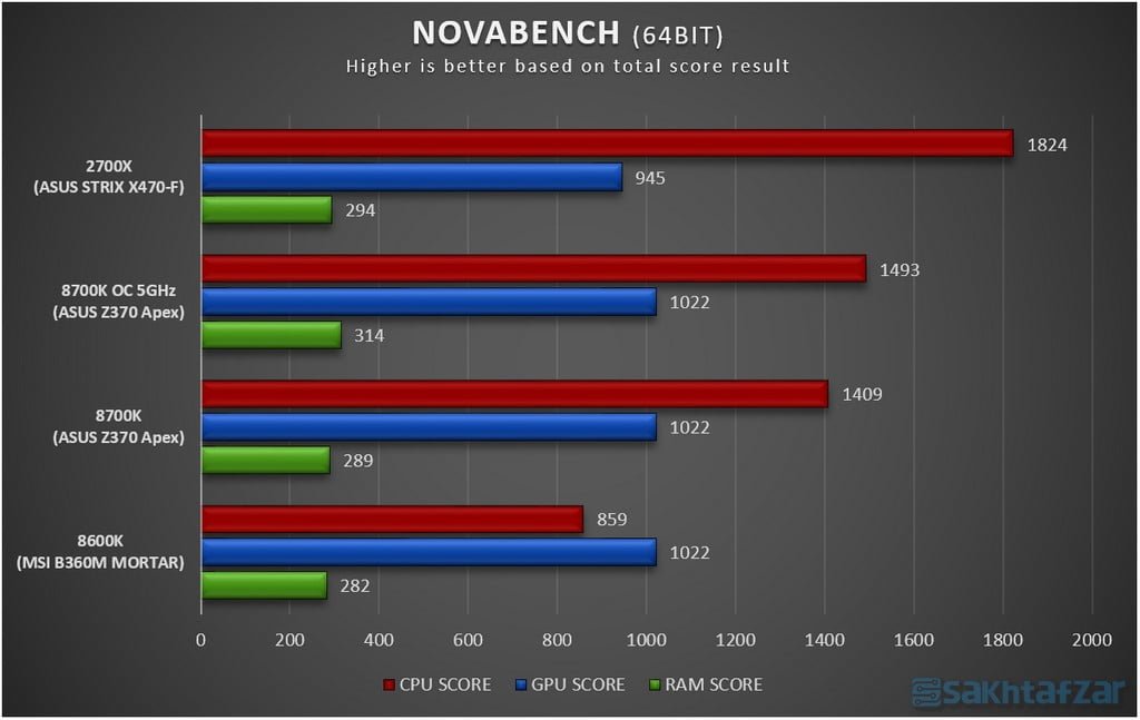تست Novabench یک تست ترکیبی است و نتیجه ی آن از جمع چهار امتیاز پردازنده، رم، گرافیک، و درایو ذخیره سازی است. با توجه به اینکه ما در طول سال گذشته از درایو های ذخیره سازی متنوعی استفاده کردیم از ذکر امتیاز درایو ذخیره سازی عبور کرده به نمایش سه امتیاز کلی پردازنده، رم، و گرافیک بسنده می کنیم. همانطور که مشاهده می کنید پردازنده ی2700X در صدر جدول قدرتمندترین سیستم را از آن خود کرده است. اما با کمی دقت در امتیاز گرافیک می توان دریافت، ضعف AMD در به اجرا درآوردن توان کارت گرافیک، همچنان به عنوان یک پاشنه ی آشیل برای آن می باشد. درحالی که کارت گرافیک سیستم تست ما، MSI GTX 1060 Armor 6G در تست های سیستم های اینتل موفق به دریافت امتیاز 1022 در این بنچ مارک شد، اما همین کارت گرافیک با پردازنده 2700X امتیازی ضعیفتر را برای خود ثبت کرد که نشان از ضعف تاریخی AMD در این بخش به شمار می رود. در زمینه قدرت رم، خوشبختانه، با بهبود عملکرد AMD شاهد اختلاف آماری کمتری در امتیازات داده شده به رم سیستم هستیم که قابل تحسین است.