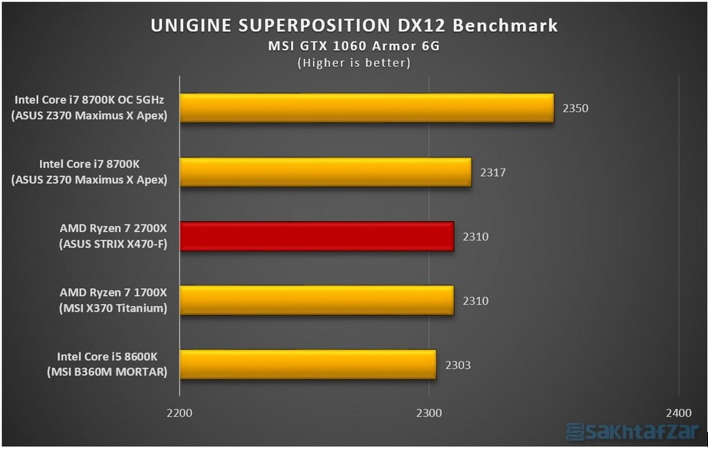 با تست Unigine Superposition کم کم به سراغ بحث گیمینگ می رویم. در اینجا تقریبا امتیاز ثبت شده برای 2700X برابر با امتیاز 1700X، و همچنین با کمی اختلاف می توان آن را همتراز 8700K نیز قرار داد.