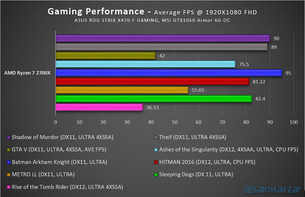 بازی در دقت 1920×1080 همچنان پر طرفدار ترین و عمومی ترین نحوه ی بازی در میان کاربران است. در اغلب تست های این 9 عنوان بازی، 2700x به خوبی ظاهر شد و توانست بیش از 60 فریم خروجی را برای کارت گرافیک ما به ارمغان آورد. تقریبا در اغلب عنواین بازی، 2700x در حد چند فریم ضعیف تر 8700K بود اما در بازی Shadow of Mordor در نتایج بدست آمده با 8700k، به نسبت عملکرد بهتری داشت. برای مقایسه قدرت بازی 2700x می توانید با نتیجه تست بازی پردازنده 8700K در بررسی مادربرد Asus Z370 Apex مقایسه بفرمایید.