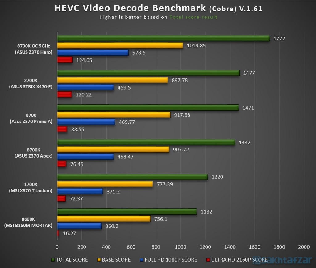 به سراغ تست تبدیل ویدیویی HEVC می رویم که از جمله معروفترین تست ها در این زمینه است. نتیجه تست 2700X تقریبا با نتیجه 8700K در حالت پیش فرض هم سطح هم هستند، اگرچه اگر بحث اورکلاک پیش آید، 8700K دوازده رشته پردازشی در فرکانس 5 گیگاهرتز می تواند با سرعت بیشتری نسبت به 2700X شانزده رشته پردازشی در حالت دیفالت، عمل کند. این موضوع نشان دهنده قدرت برتر پردازنده های اینتل در بحث تبدیل های ویدیویی است.