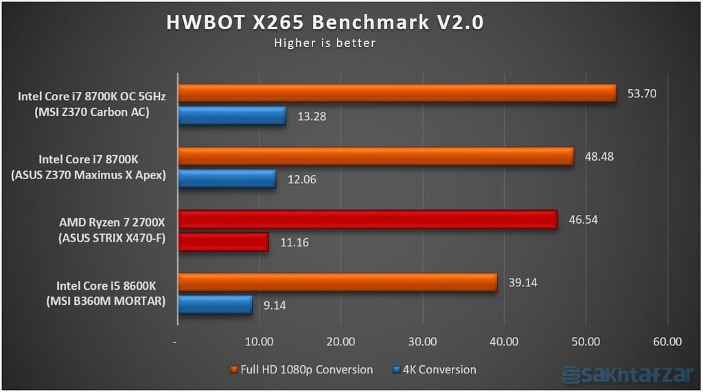 در تست تبدیل ویدیویی X265 نیز، پردازنده ی 2700X پشت سر 8700K ایستاد.