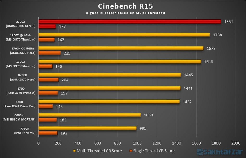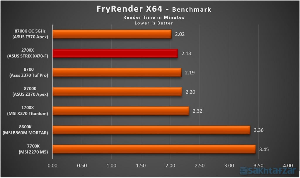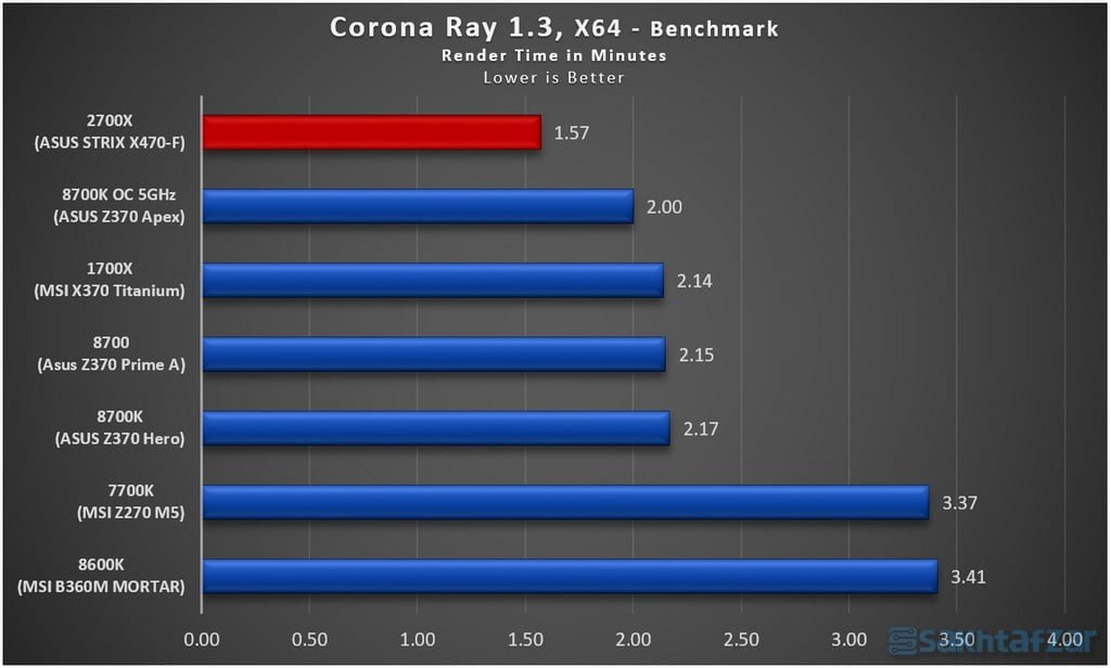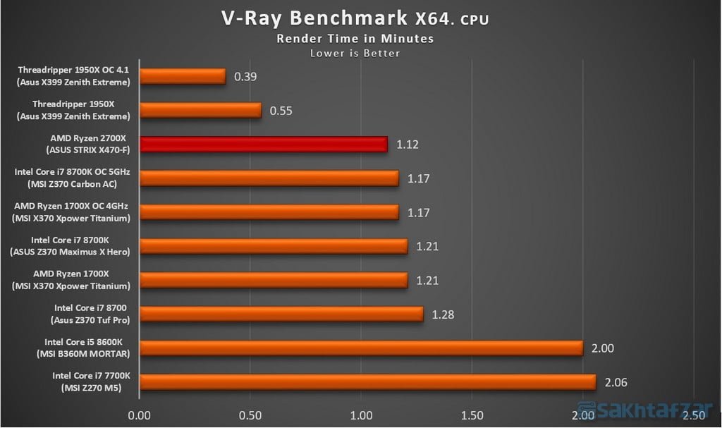 و در پایان بررسی فنی، به نقطه قوت 2700X نگاهی می اندازیم، جایی که در بحث رندرینگ و نرم افزار های مهندسی مثل V RAY،CORONA، و تست CINEBENCH، شرکت AMD با 2700X گوی سبقت را از اینتل می رباید و بدون استثنا در صدر لیست پردازنده های Mainstream در کلیه جداول تست های رندرینگ قرار می گیرد.