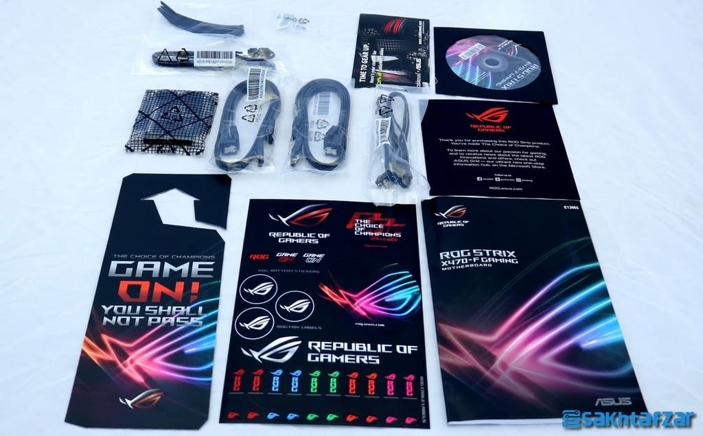 اقلام داخل جعبه، شامل: 4 عدد کابل SATA، یک جفت کابل افزایش طول، یک عدد سه پین برای Addressable RGB و دیگری چهار پین برای کانکتور RGB، پل SLI، یک بسته زیپ کابل پلاستیکی، دفترچه راهنما، DVD درایور، و یک برگه برچسب ROG می شود. تقریبا می توان گفت با توجه به تدارک مفصلی که ایسوس برای اقلام داخل جعبه در نظر گرفته است، با یک مادربرد High End طرف هستیم.