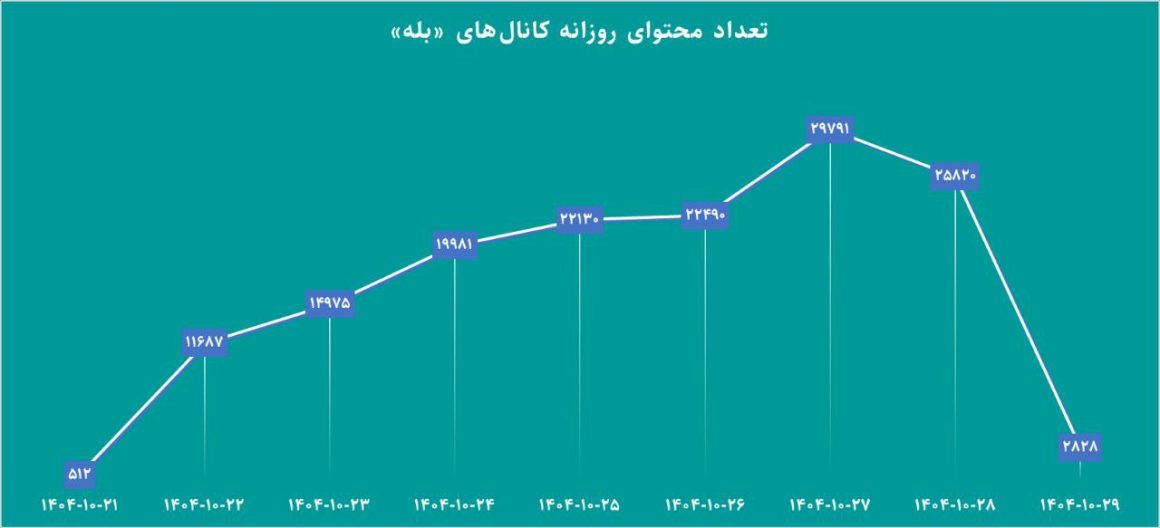 بر اساس گزارش، 150 هزار محتوا از سوی 9 هزار کاربر در آن بازه زمانی یک هفتهای منتشر شده است. کمترین انتشار محتوا در روز 21 دیماه با 512 بوده و بیشترین محتوا، 27 دی ماه با 27 هزار و 791 پست در کانالهای بله به اشتراک شده است. دلیل این حجم حداقلی و حداکثری کندی سرعت اینترنت در روزهای اولیه و رفعشدن مشکل نت داخلی و اعتماد یا کوچ اجباری کاربران به استفاده از این پیامرسان بهعنوان جایگزین پیامرسانهای خارجی مانند تلگرام و واتساپ مربوط بوده است.