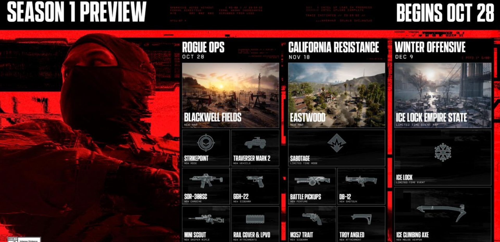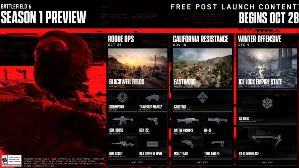 طبق اعلامیه شرکت EA و استودیوهای سازنده Battlefield، امکان دسترسی به فصل اول بازی موردانتظار «بتلفیلد 6» از تاریخ 6 آبان 1404 (مصادف با 28 اکتبر 2025) آغاز خواهد شد. فصل اول بازی مذکور در سه مرحله Rogue Ops، California Resistance و Winter Offensive اجرا خواهد شد. هر مرحله یک نقشه جدید و مجموعهای از آیتمها و سلاحهای منحصربهفرد را به بازی اضافه میکند. جزئیات هر مرحله به شرح زیر است: