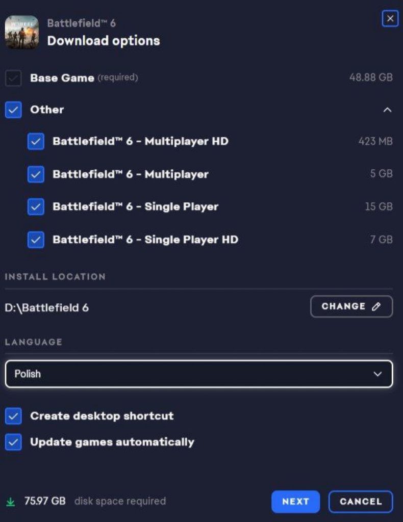 طبق تصویر جدیدی که از صفحه نصب بازی موردانتظار «بتلفیلد 6» در شبکه اجتماعی X به اشتراک گذاشته شده است و به نظر میرسد حجم کلی این عنوان، معادل 75.97 گیگابایت خواهد بود. اما نکته مهمتر از حجم نهایی، جزئیاتی است که تصویر مذکور از ساختار نصب بازی «بتلفیلد 6» آشکار میکند؛ قابلیتی که به گیمرها کنترل بالایی روی انتخاب فایلهای نصبی میدهد: