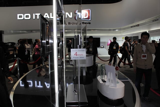 زمانی که از درب غربی وارد غرفه ال جی می شدید با دیواری محدب بزرگ از تلویزیون سه بعدی ال جی رو به رو می شدید که در حال پخش دموی سه بعدی بود. این فضا به حدی بزرگ بود که چند ثانیه خشک می شدید! بعد از ورود درست در مقابل شما تلویزیون های OLED سه بعدی این شرکت وجود داشت که در آن علاوه بر کیفیت و کنتراست، زاویه دید در حالت سه بعدی هم بهبود پیدا کرده بود و بدون اغراق خود من در چند جا می خواستم دستم را برای گرفتن اجسام دراز کنم! تلویزیون 55 اینچی ال جی بزرگترین تلویزیون سه بعدی OLED دنیا است که در این نمایشگاه به نمایش گذاشته شده بود. این تلویزیون حداکثر 4 میلی متر قطر دارد و به عنوان نازکترین تلویزیون در دنیا شناخته می شود (البته این متن نوشته روی کاغذ بود اما من هم فکر می کنم تلویزیونی نازکتر از این نداریم، نظر شما چیست؟!).