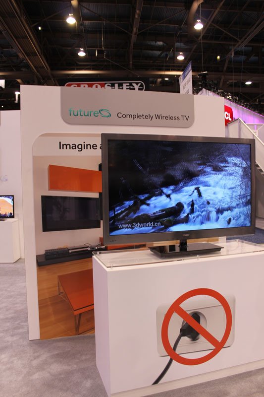 Haier از جمله مارک های تجاری است که در زمینه تولید محصولات خانگی فعالیت می کند و درصدی از بازار کشور را در اختیار دارد. امسال این شرکت غرفه بزرگی در نمایشگاه CES 2012 داشت و محصولات مختلفی را برای نمایش گذاشته بود، اما در بین تمام محصولات این شرکت تلویزیون تمام بی سیم این شرکت بیش از دیگر موارد خودنمایی می کرد. این تلویزیون سه بعدی کاملا بی سیم است و نیاز به هیچ سیمی ندارد. تنها برای این استفاده از این دستگاه نیاز است آن را روی میز بگذارید و روشنش کنید!