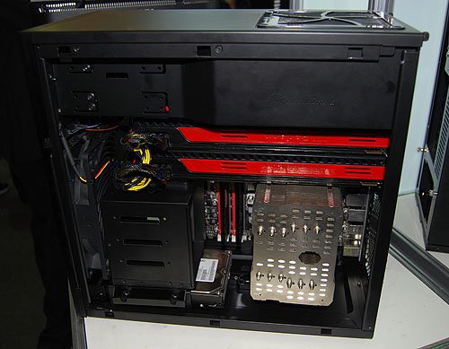 احتمالاً هرکسی که در نمایشگاه کامپیوتکس 2011 حضور داشته و از کنار کیس TJ12 این شرکت عبور کرده، دچار شک یا حمله قلبی شده است! در داخل این کیس شش کارت گرافیک (دو GTX 580 و چهار GTX 480)، دو منبع تغذیه 1200 واتی نصب شده است. البته امکان نصب شش کارت گرافیک (آن هم از نوع دو اسلاتی) روی هیچ مادربوردی وجود ندارد و به احتمال زیاد SilverStone با انجام این کار خواسته فضای موجود در کیس خود را به نمایش بگذارد. در واقع قطعات این کیس از نوع ماژولار بوده و در حداکثر طول آن میتوان شش کارت گرافیک را داخل آن نصب کرد.
