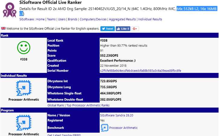 پایگاه داده SiSoft Sandra یک نمونه از مدل های 64 هسته ای را به طور رسمی در پایگاه خود جای داده است؛ مسئله ای که خبر ساز به نظر می رسد، افزایش حافظه سطح L3 به 2 برابر است! هر چند که AMD بر خلاف اینتل اکثر بر روی کش های L2 تاکید بیشتری داشت، اما به تازگی به تقویت کش های سطح L3 پرداخته است. طبق داده های این پایگاه، در سطح L2 برای هر هسته 512 کیلوبایت حافظه در نظر گرفته شده است.