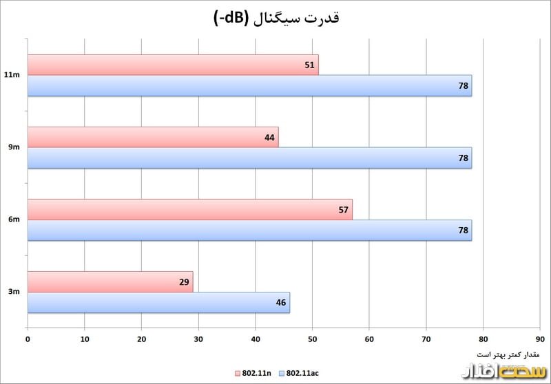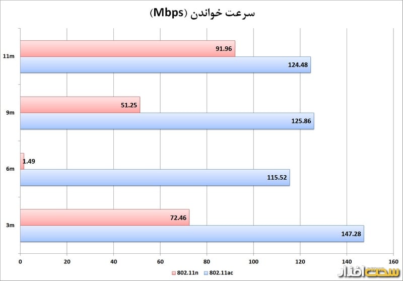 همانطور که انتظار داریم کارایی استاندارد 802.11ac در مقایسه با 802.11n افزایش چشمگیری داشته است و در فواصل نزدیک کارایی بسیار خوبی را نمایش میدهد. اما همانطور که در مقاله آشنایی با فناوری و استاندارد 802.11ac خواندیم، افزایش فاصله و به میان آمدن موانع باعث افت شدید قدرت سیگنال شده است. این مسئله محدودیت کلی درباره استاندارد 802.11ac است، اما اگر شاید در این محصول از آنتن خارجی استفاده میشد، قدرت سیگنال افزایش پیدا میکرد. اما نکته جالب اینجاست که با افت شدید سیگنال همچنان ثبات آن قابل قبول بوده و سرعت خواندن اطلاعات نیز در سطح خوبی قرار میگیرد.